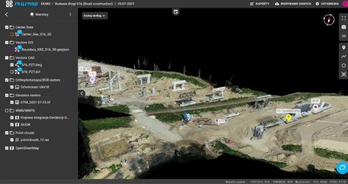 A key element of successful construction monitoring is not only the acquisition of the data itself, but also its proper organization and sharing. The SkySnap portal makes it possible to integrate all photogrammetric and geospatial data in one central location. This allows all people involved in the project to work on the same up-to-date materials, without the risk of using outdated files or different versions of documentation.